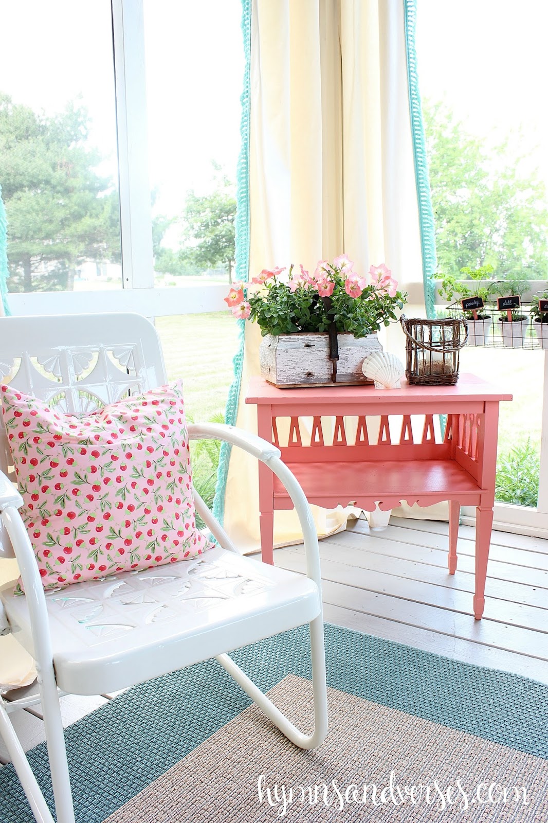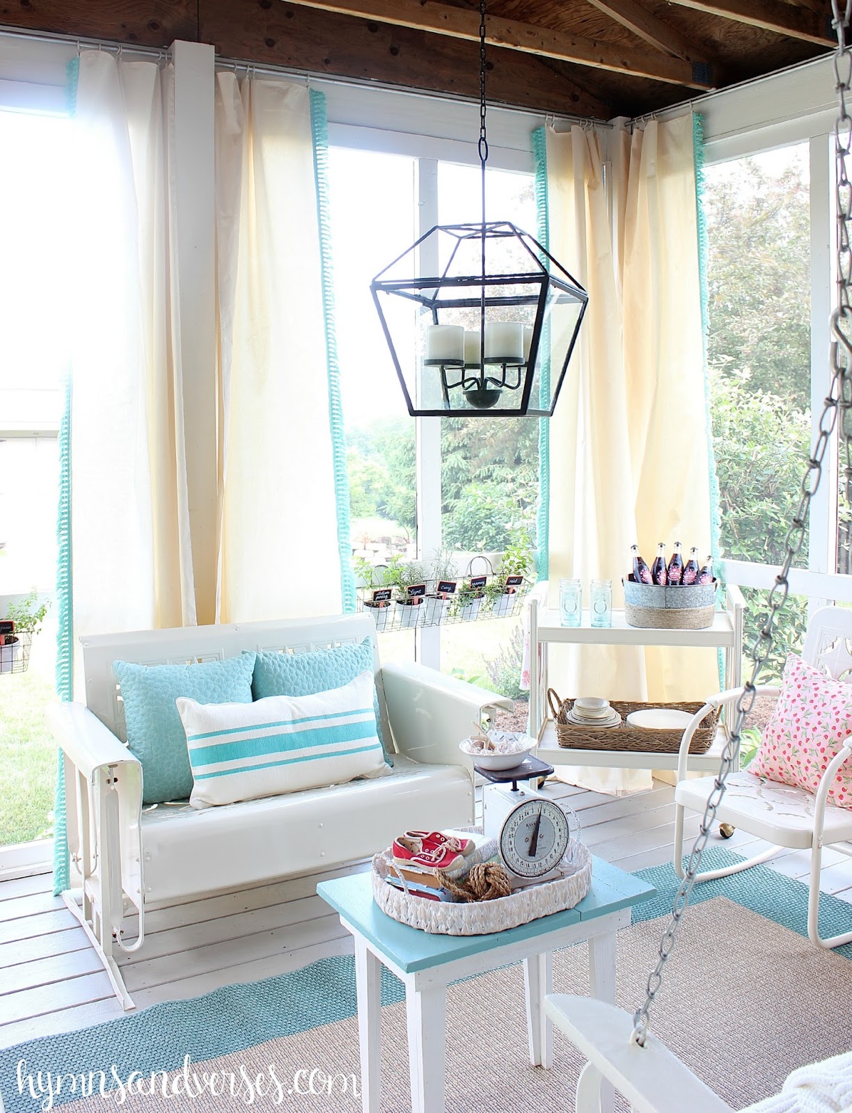 Now onto the screen porch. My favorite place to be in the summertime. Last summer my porch was more bold and bright – you can see it HERE. This year, I wanted a more cottage country look with softer colors of turquoise and coral.