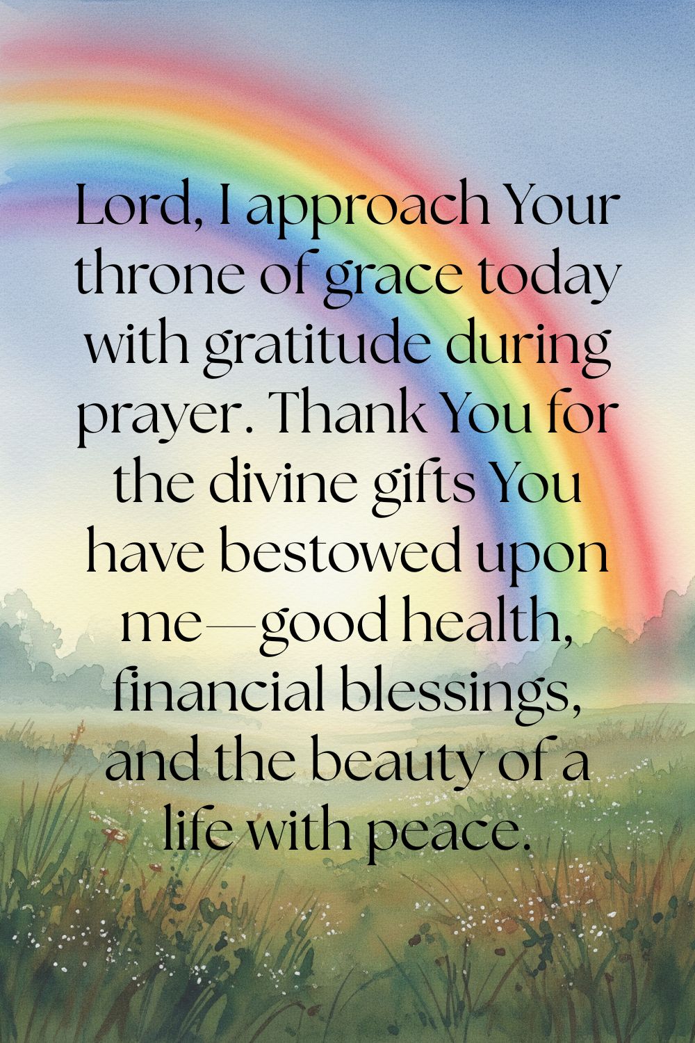 Lord, I approach Your throne of grace today with gratitude during prayer. Thank You for the divine gifts You have bestowed upon me—good health, financial blessings, and the beauty of a life with peace. May I never take Your gifts for granted. Amen.
