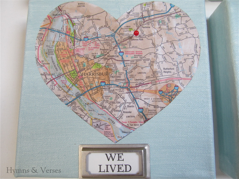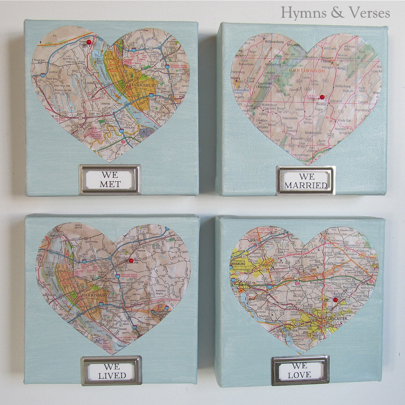 Paint your four canvas pieces the color of your choice. I used a sample of paint color I had on hand. While the paint is drying, gather your maps and find the locations where you and your spouse met, married, lived, and now love. We have lived in Pennsylvania for all of those events, so I needed 3 different Pennsylvania maps. My father-in-law gave me two maps and I found the other in the garage. Make a heart template that is just slightly smaller than your canvas, making sure to leave enough room for your label at the bottom, and use it to trace the areas needed for the four heart locations and cut them out.